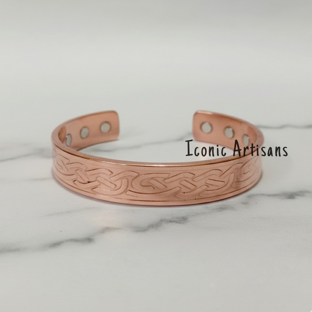 Intricate Celtic Artistry The Iconic Artisans Celtic Knotwork Cuff is a tribute to classic heritage and meticulous metalwork. Meticulously handcrafted from solid, 100% pure copper, the exterior features a repeating Celtic knot engraving—a symbol of the eternal cycle of life and nature. This detailed pattern is set against a smooth, high-polish frame, creating a sophisticated look that transitions perfectly from casual to formal wear.