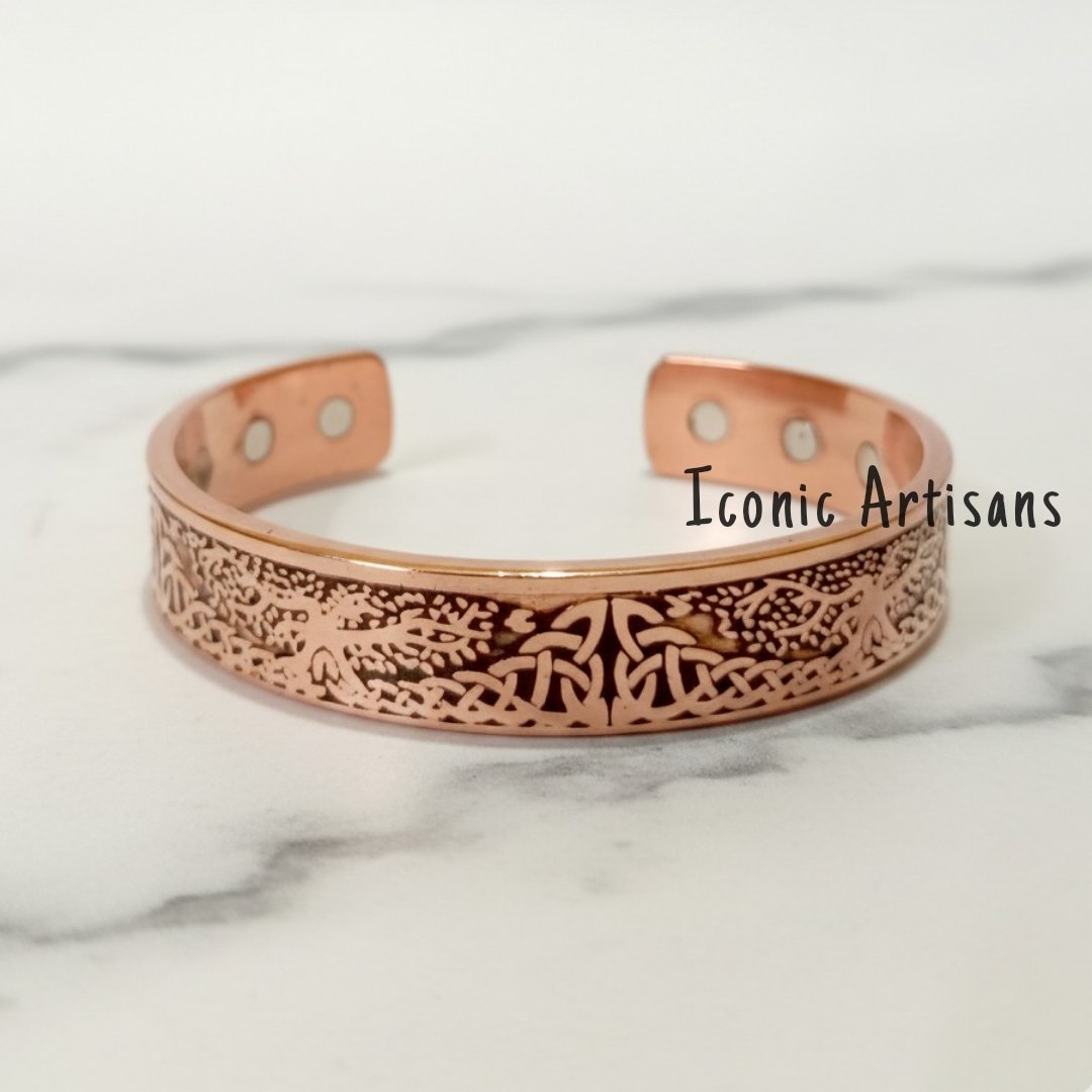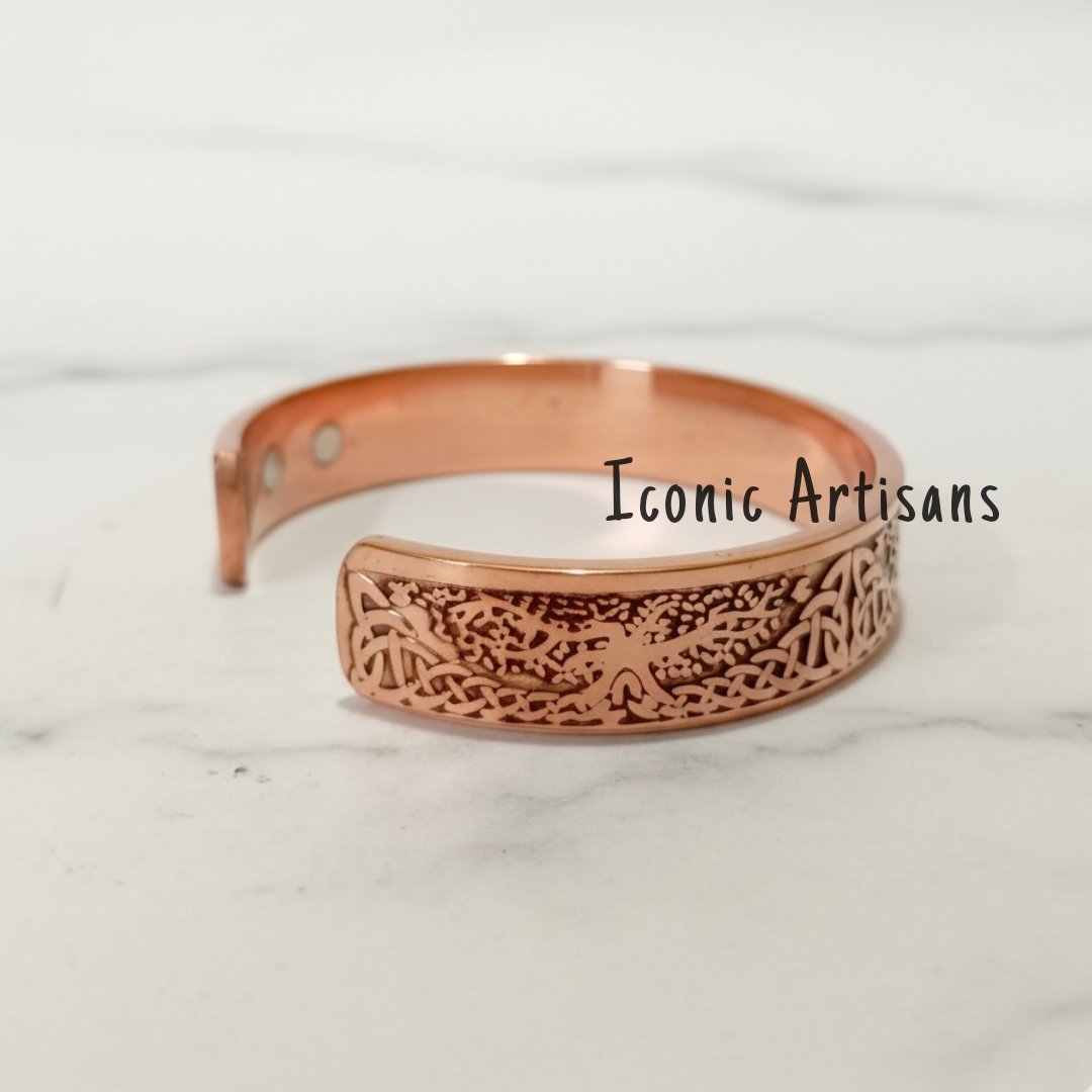 Sacred Symbols & Artisan Detail The Iconic Artisans Tree of Life Cuff is a beautiful tribute to heritage and nature. Meticulously handcrafted from solid, 100% pure copper, the exterior features a stunning relief of the Tree of Life—representing growth, strength, and connection—intertwined with traditional Celtic knotwork symbolizing eternity. This intricate engraving is set against a textured background, creating a rich, antique look that complements any style.