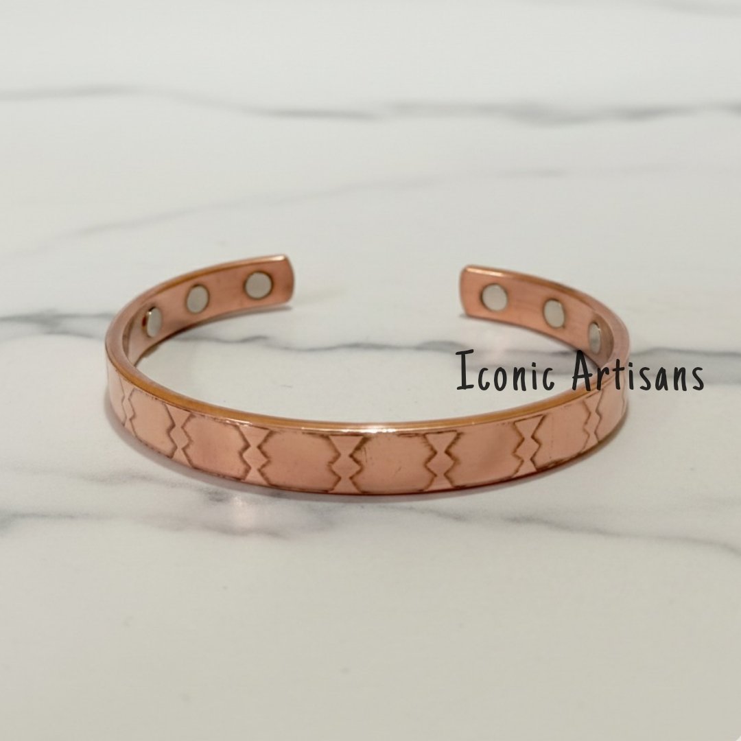 Modern Geometric Elegance Step away from traditional plain bands with the Iconic Artisans Geometric Engraved Cuff. Crafted from 100% pure, solid copper, this bracelet showcases a repeated, precision-engraved pattern that adds a modern, architectural touch to the classic copper glow. Its sleek profile makes it an ideal choice for both professional and casual wear.