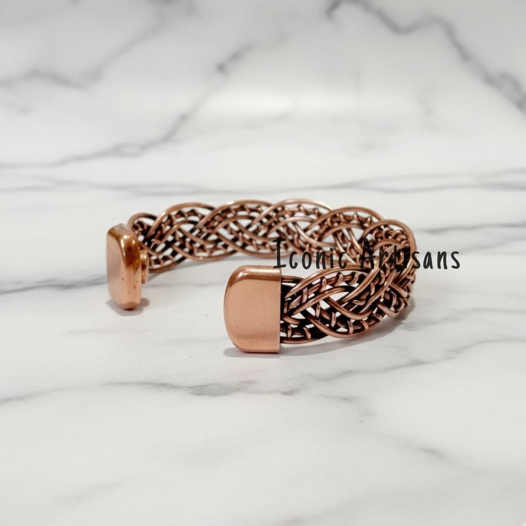 Exquisite Open-Work Artistry Experience superior craftsmanship with the Iconic Artisans Woven Lattice Bracelet. This cuff is individually handcrafted from 100% pure copper wires, expertly interlaced to create a complex, open-work lattice design. The airy, “basket-weave” structure provides a stunning visual depth and texture that sets it apart from solid cuffs, ensuring it remains comfortable and breathable for all-day wear.