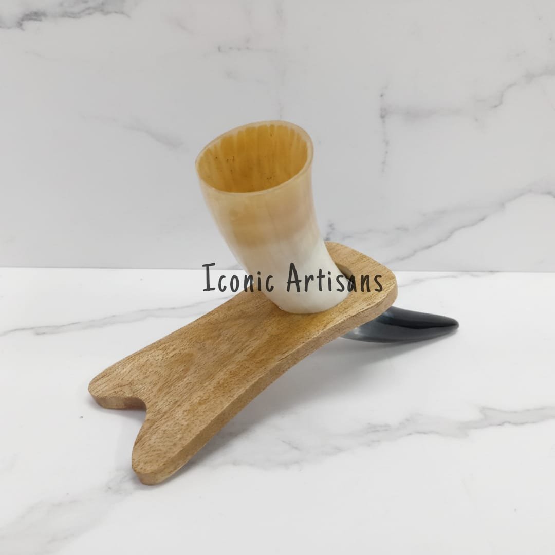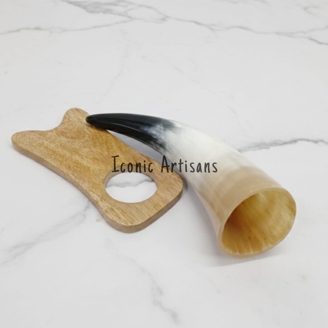 Elegant Wooden Display Stand Unlike traditional horns that must be held or carried, this set includes a bespoke wooden stand. The stand is carved to cradle the horn perfectly, allowing you to display it proudly on your mantel, desk, or bar counter when not in use.