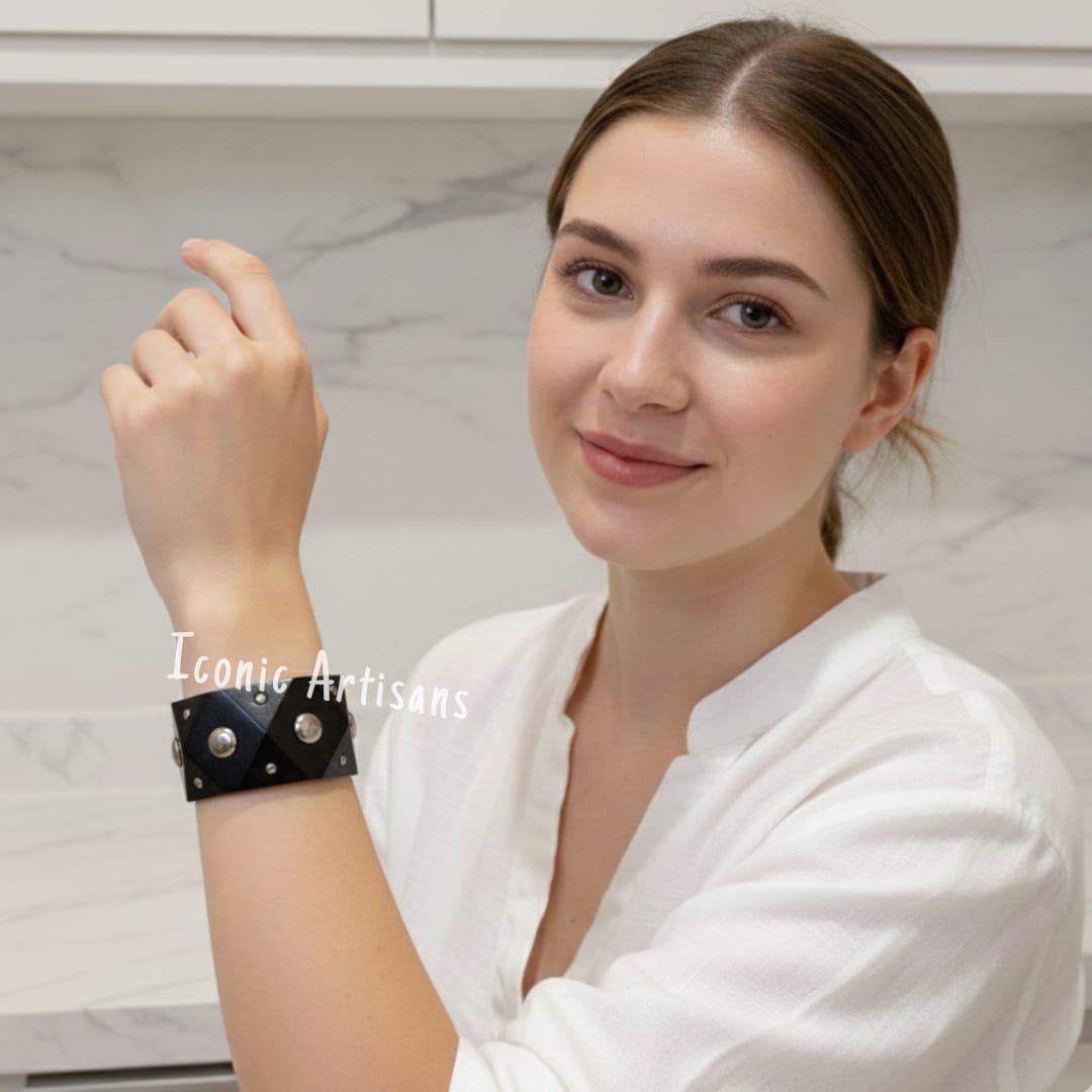 Step out in style with the Iconic Artisans Studded Geometric Bangle. This wide-profile cuff is designed for those who love bold, structural jewelry that commands attention.