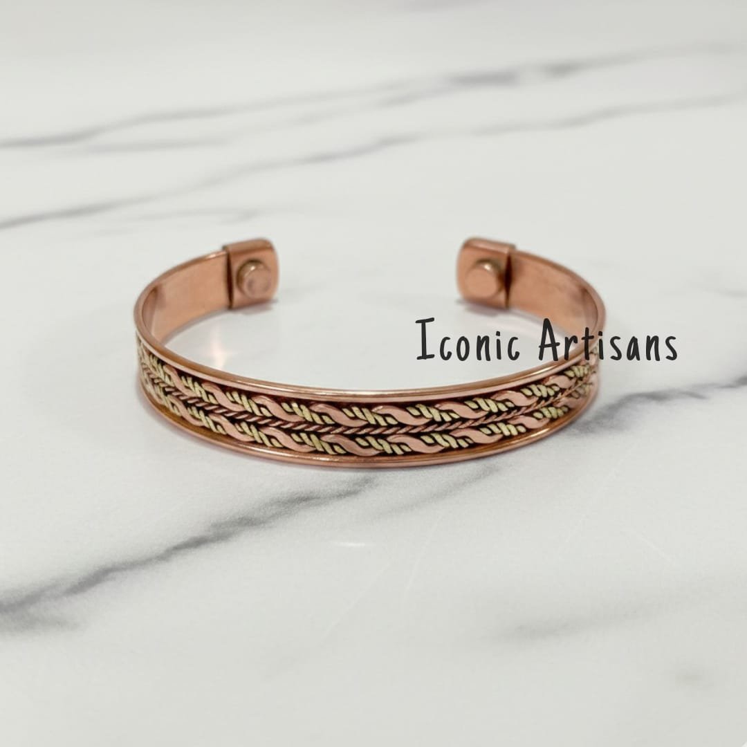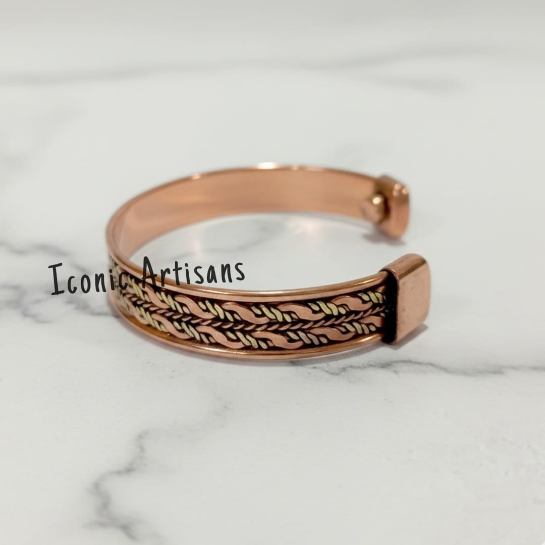 Presenting an exquisitely designed Two-Tone Magnetic Cuff Bracelet from Iconic Artisans. This piece stands out with its intricate central inlay, which features a beautiful, finely detailed leaf-like or laurel weave pattern in contrasting brass or a golden-tone metal. The rich warmth of the pure copper body perfectly complements the bright, detailed accent, creating a luxurious and timeless look.