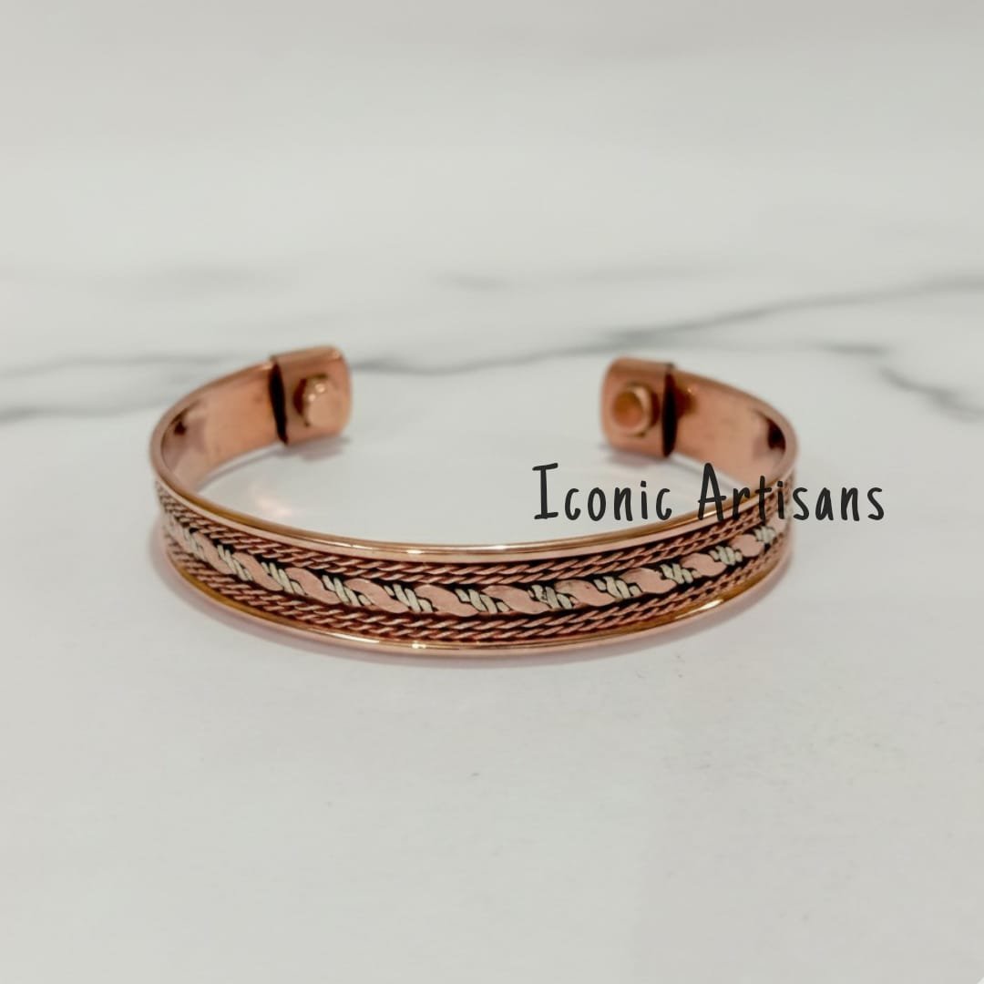 Discover the elegance of this Two-Tone Magnetic Cuff Bracelet from Iconic Artisans. This piece showcases a stunning contrast, pairing the rich, rose-gold hue of pure copper with the bright, cool shine of a silver-tone metal (such as white brass or steel) used for the central band. The inlay features an intricate, delicate leaf or laurel woven pattern, adding a touch of natural beauty and superior handcrafted detail.