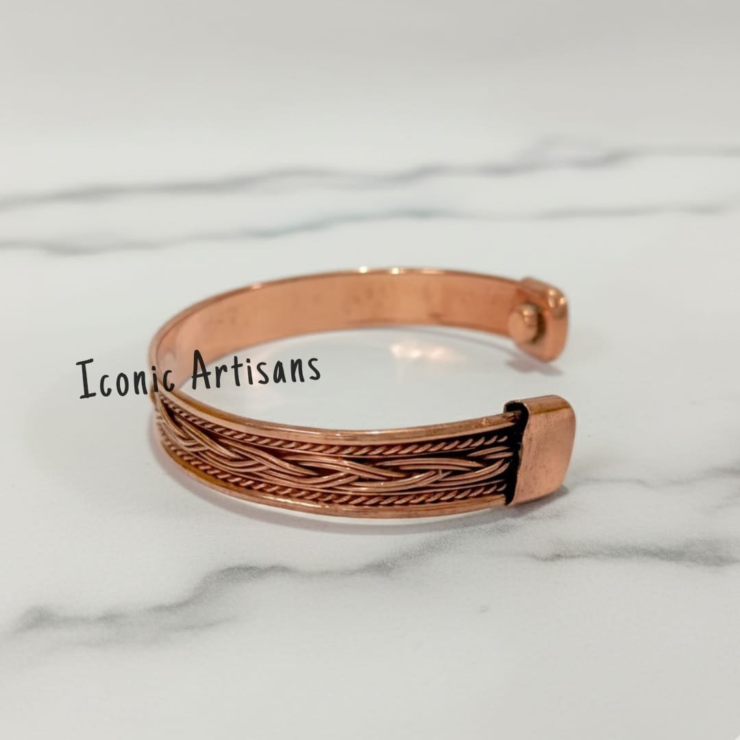This beautiful copper magnetic cuff bracelet from Iconic Artisans showcases exceptional, detailed craftsmanship. Made entirely from pure, solid copper, it features an intricate, fine-textured braided or basket-weave pattern across its central band, giving the piece depth and visual sophistication. The rich, warm tone of the copper is left uncoated, allowing it to develop a natural, unique patina over time—a hallmark of authentic copper jewelry.