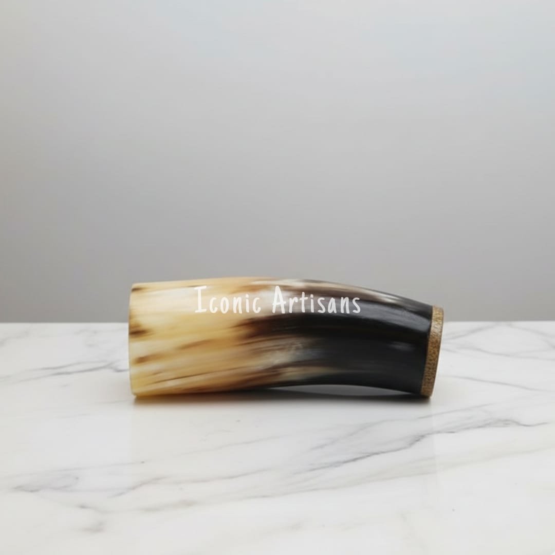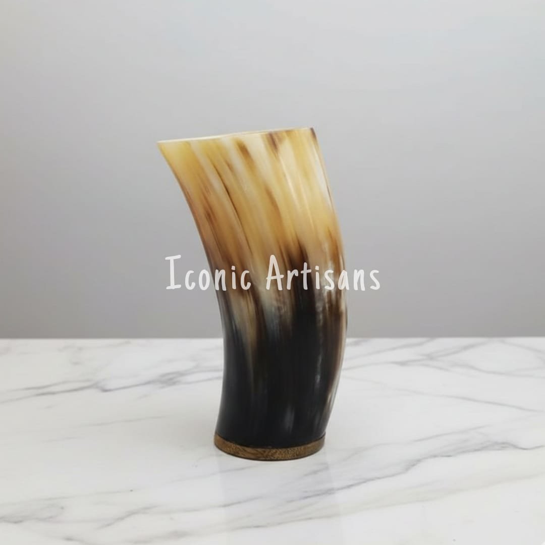 Unlike traditional pointed horns, this model features a precision-fitted wooden base, allowing it to stand upright on any flat surface. The exterior is buffed to a smooth, glass-like finish that highlights the deep blacks, warm ambers, and creamy ivory tones of the natural material. Whether you are using it for a themed celebration or displaying it as a rustic centerpiece, this horn brings a sense of ancient history and artisanal luxury to your collection.