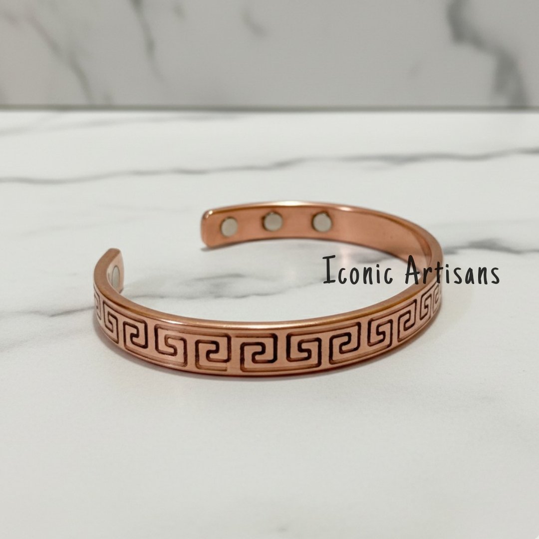 A Symbol of Eternity and Style The Iconic Artisans Greek Key Bracelet brings ancient symbolism to your modern wellness routine. Crafted from solid, 100% pure copper, the exterior is engraved with the iconic Meander pattern—a symbol used since ancient times to represent infinity and the eternal flow of life. Its polished rose-gold finish ensures it stands out as a piece of fine artisan jewelry.