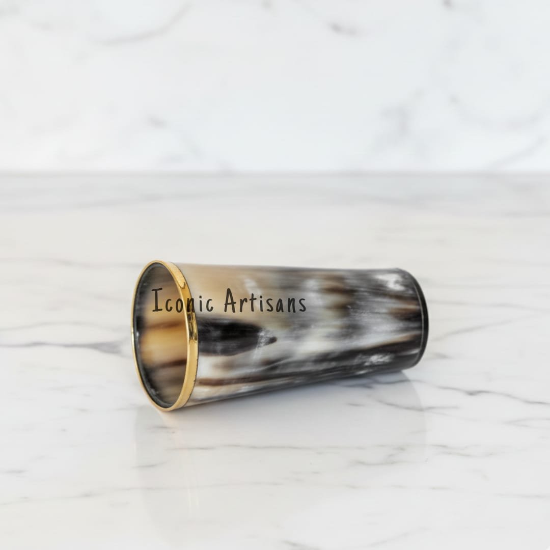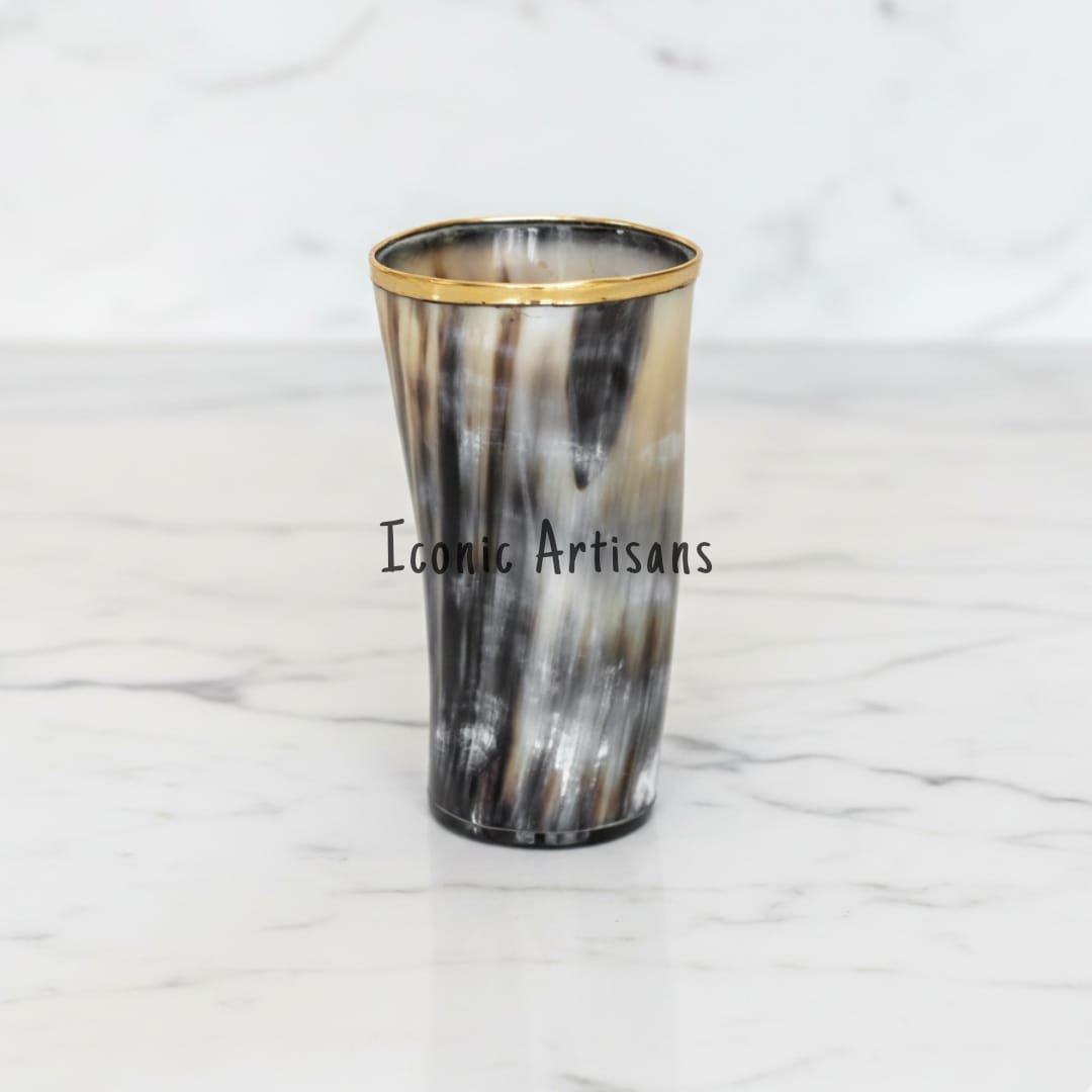 Elevate your home bar or dining experience with this exquisite, handcrafted tumbler made from 100% natural horn. Featuring a luxurious gold-finished brass rim and unique organic patterns, each piece is a one-of-a-kind work of art. Perfect for cold beverages or as a sophisticated vanity accent.