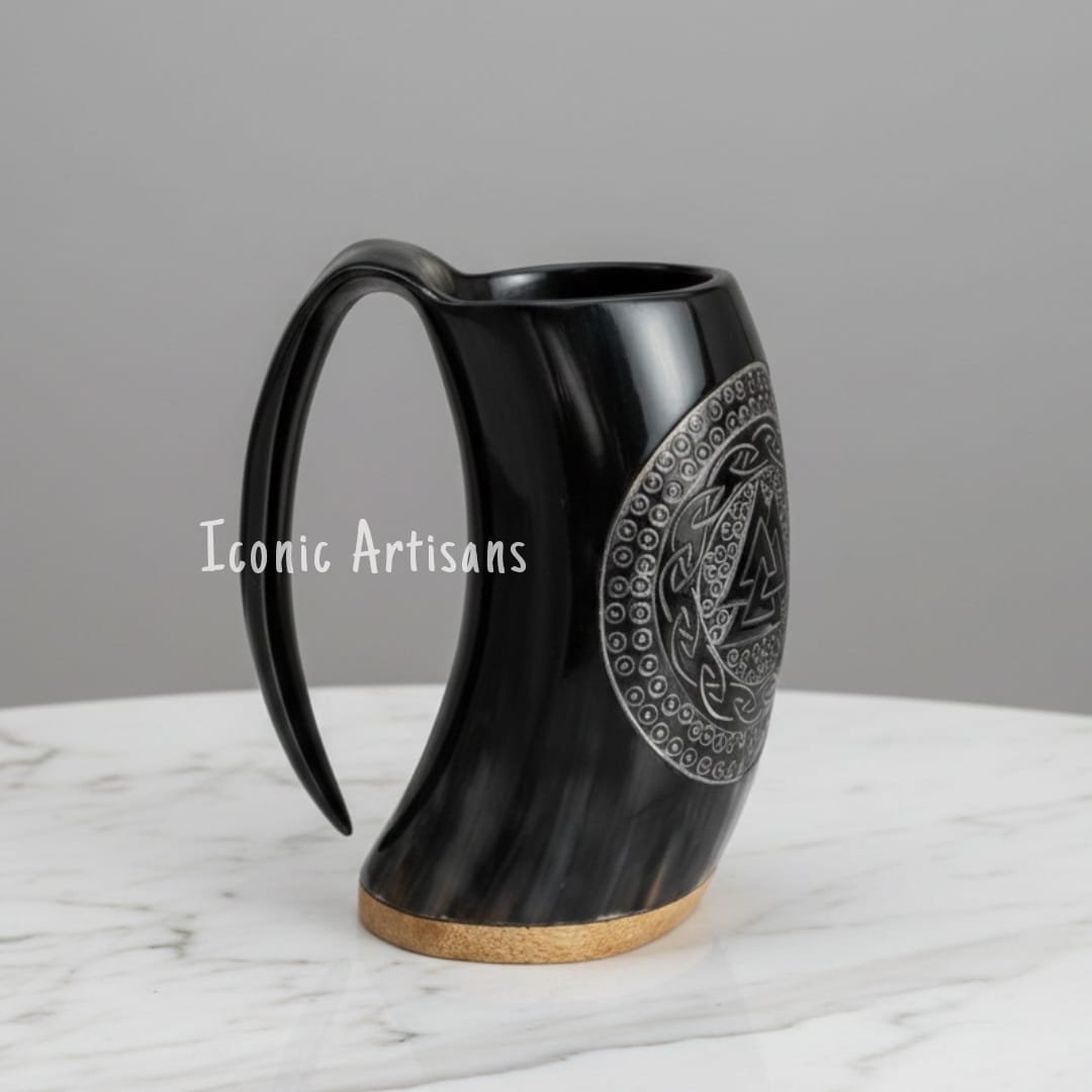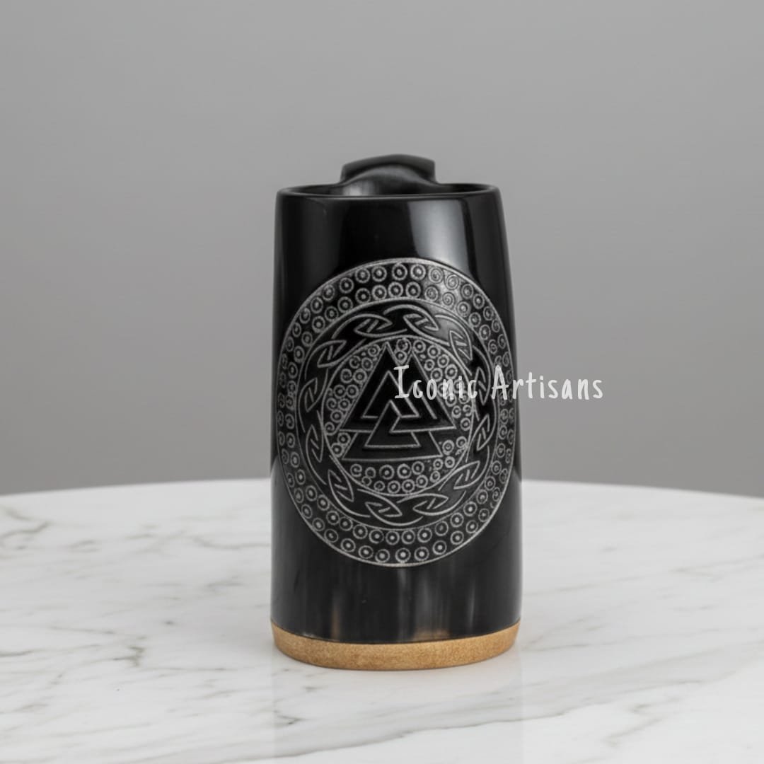 The exterior is polished to a glass-like finish, showcasing the natural grains and deep black tones of the horn. The centerpiece of the design is a masterfully engraved Valknut symbol, intricately bordered by traditional Celtic knotwork and circular patterns. To ensure a mess-free experience, the mug is fitted with a solid wooden base that is resin-sealed to prevent leaks.