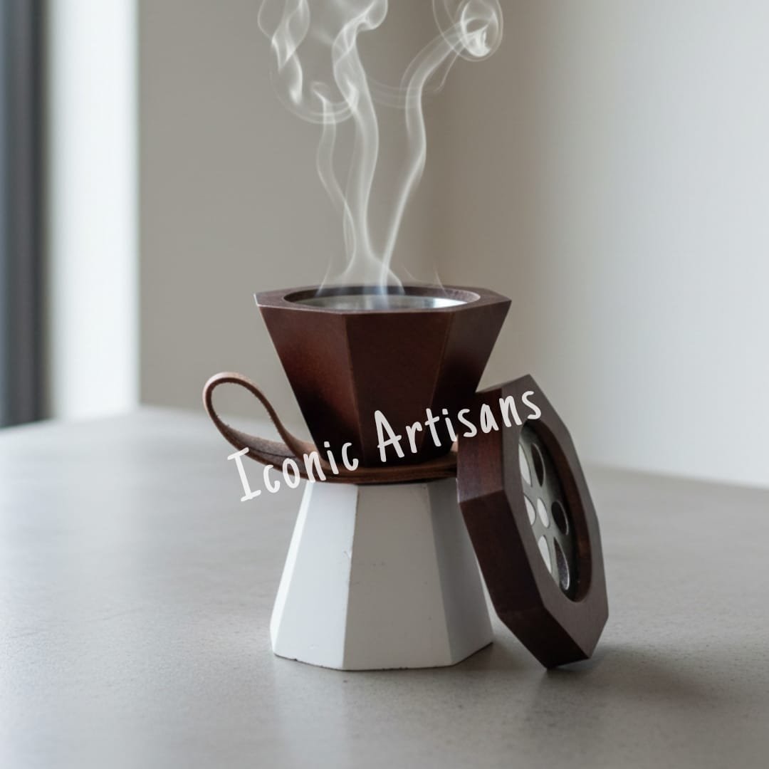 Ventilated Lid: The matching hexagonal wooden lid features a patterned metal screen insert, allowing the fragrant smoke to escape while safely containing the hot charcoal and incense.