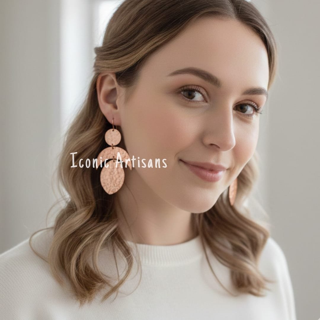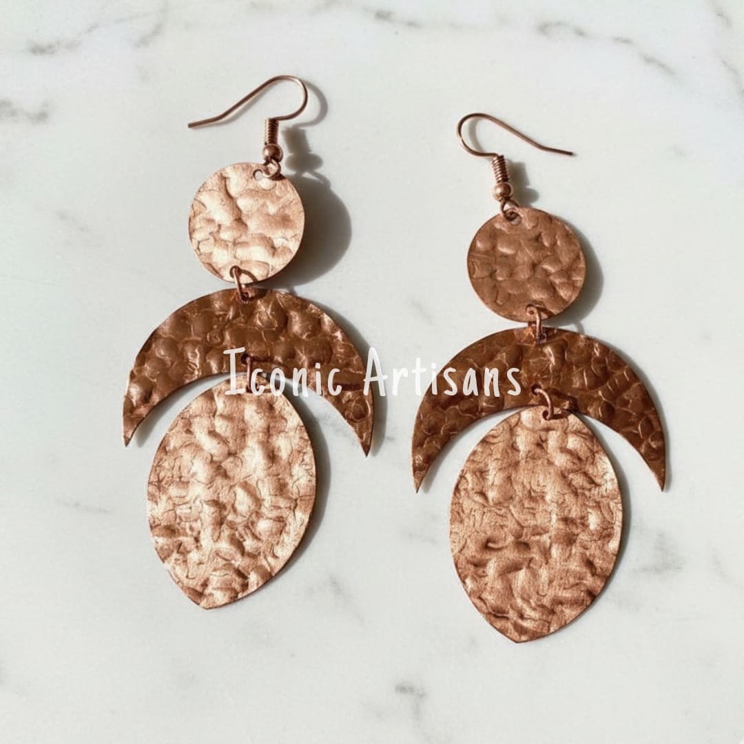 Each pair is masterfully handcrafted to create a striking three-tier silhouette. The design begins with a polished copper disc, leading into a wide crescent moon arc, and finishing with a large, graceful oval drop. Every element features a deep hammered texture that creates a beautiful play of light and shadow, highlighting the warm, rosy tones of the copper.