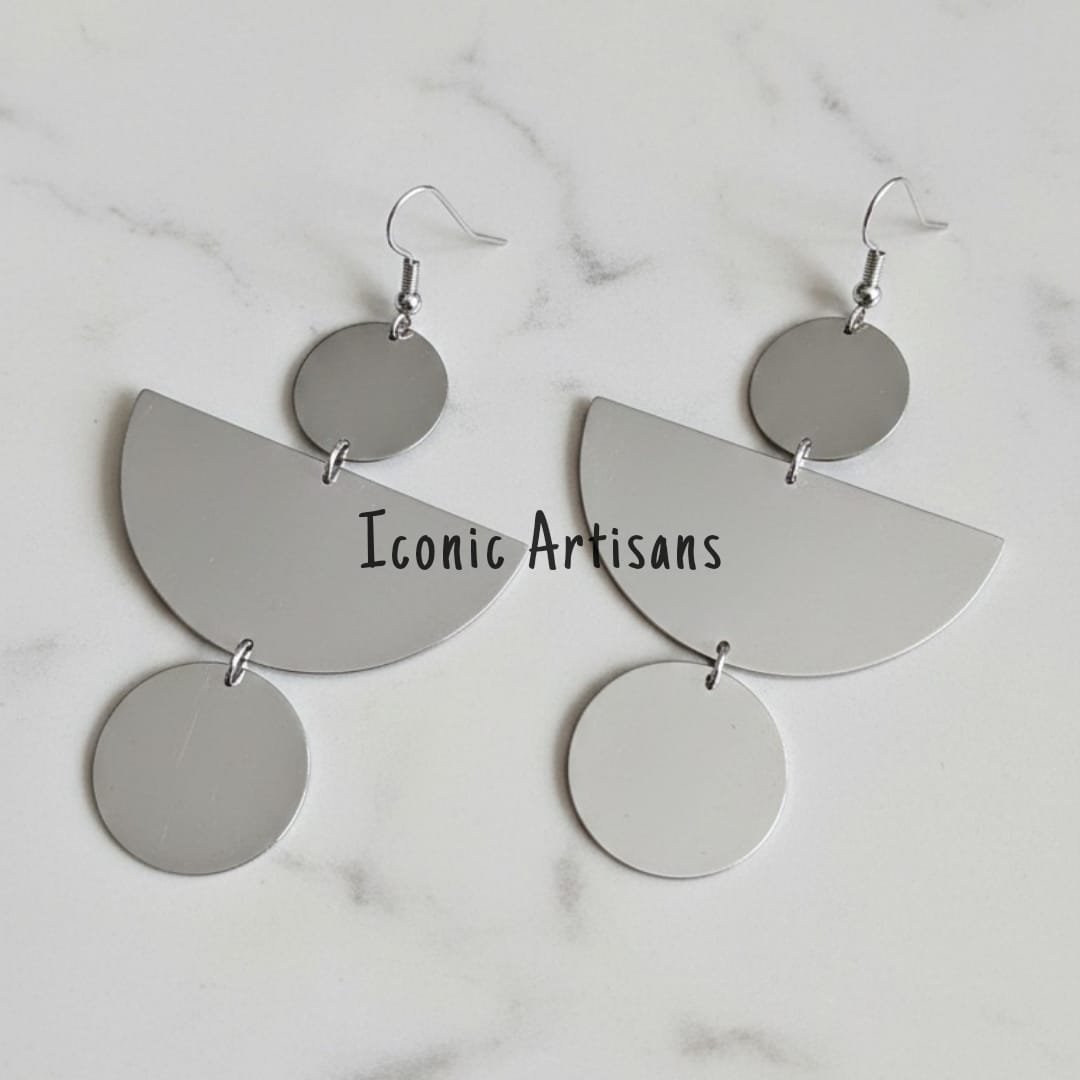 Thoughtfully designed for the modern woman, these earrings feature a captivating three-tier symmetric layout. The design begins with a polished silver-tone disc at the top, leading into a wide, gracefully curved half-moon (semicircle) middle piece, and finishing with a matching circular disc drop at the bottom.