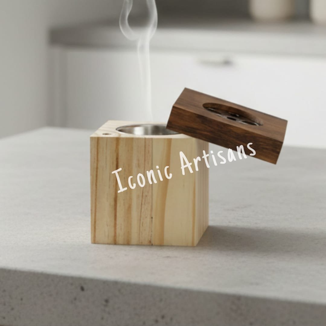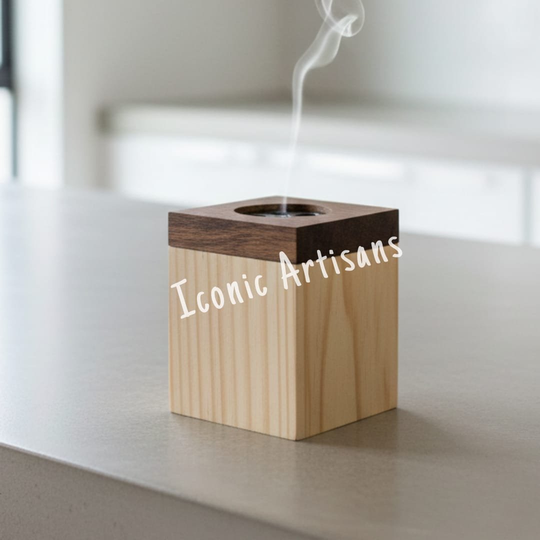 Contrasting Lid: The top lid is made from a darker wood, creating a striking contrast and adding visual interest to the simple cube shape. The lid includes a small perforated area to safely release the fragrant smoke.