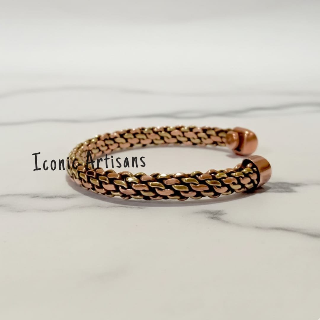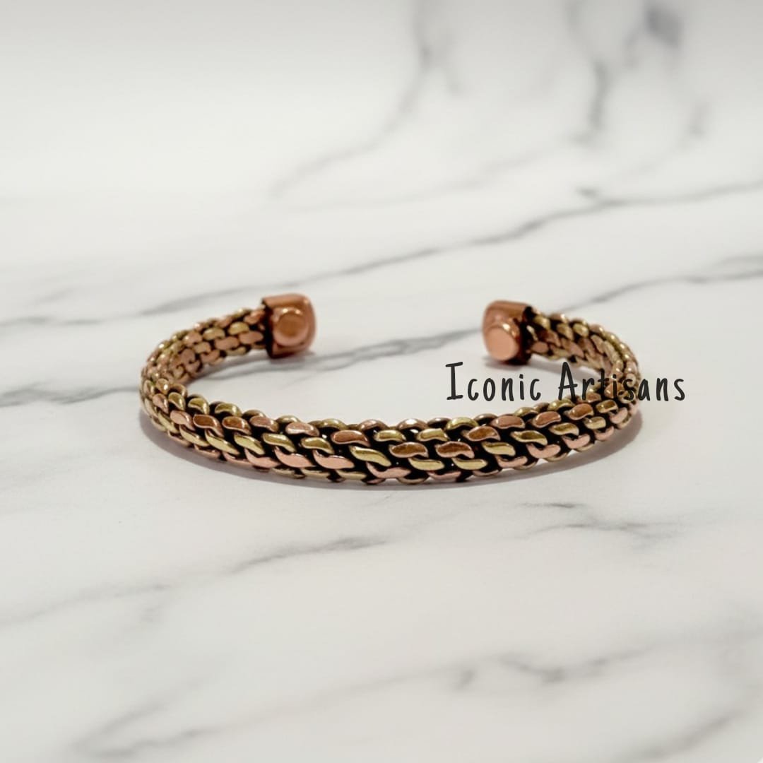 Masterful Interwoven Design Discover the perfect blend of artistry and tradition with the Iconic Artisans Braided Magnetic Bracelet. This piece features a complex, rounded weave created by interlacing high-quality copper and brass wires. The result is a multi-dimensional, tri-tone effect that showcases the warm glow of copper alongside the bright luster of gold-tone brass, making it a versatile accessory for any wardrobe.