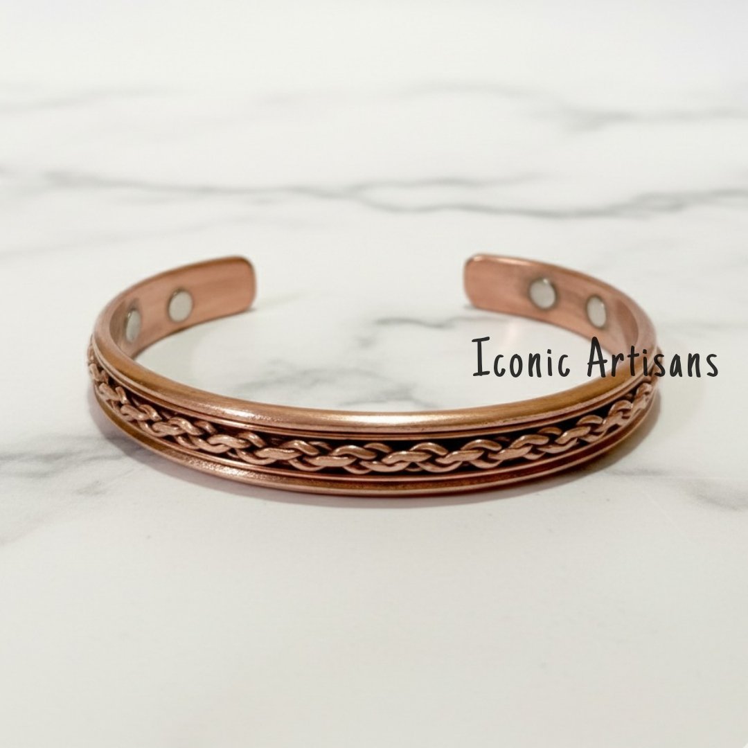Intricate Braided Craftsmanship The Iconic Artisans Braided Inlay Cuff is a masterpiece of traditional metalwork. Meticulously handcrafted from solid, 100% pure copper, the exterior features a recessed center channel housing a beautifully woven braided rope pattern. This rich texture is framed by smooth, high-polish borders, creating a sophisticated look that transitions perfectly from casual to formal wear.