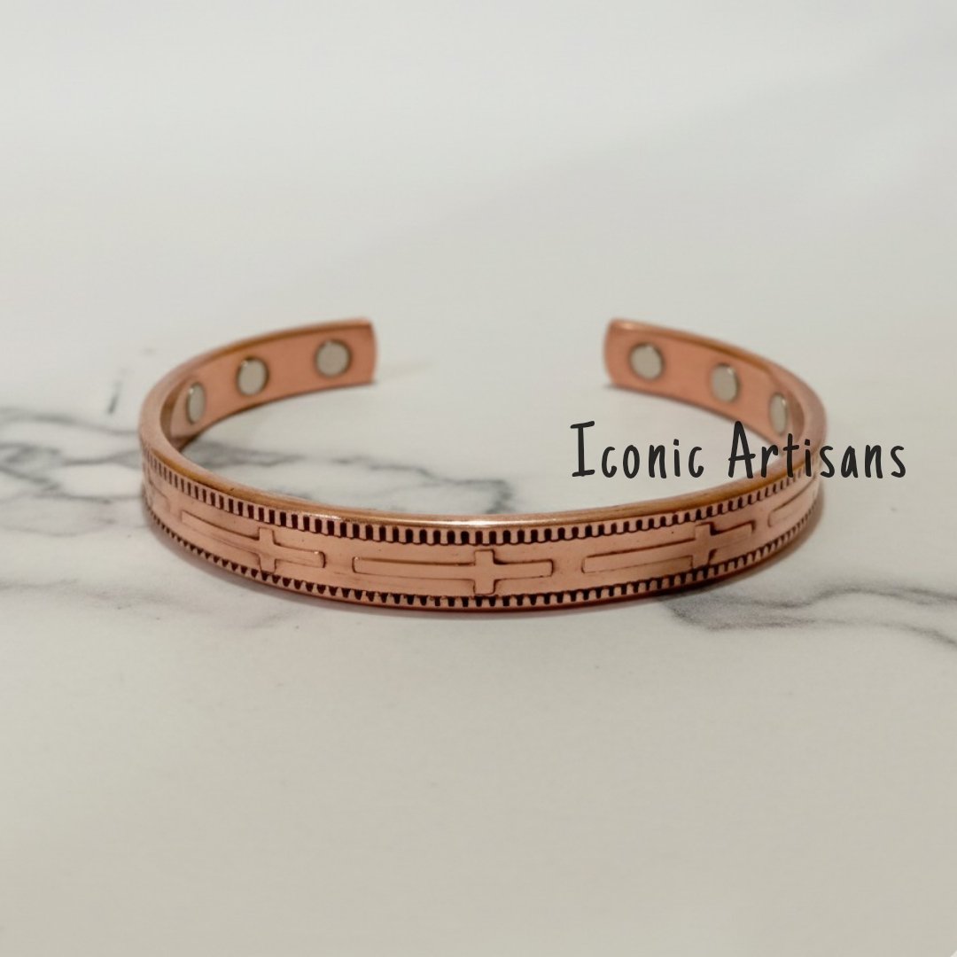 Carry a symbol of faith and wellness wherever you go. This 100% pure copper cuff features a sleek cross-engraved design and six powerful therapeutic magnets. Handcrafted for a comfortable, adjustable fit, it offers a discreet and meaningful way to support your daily well-being.