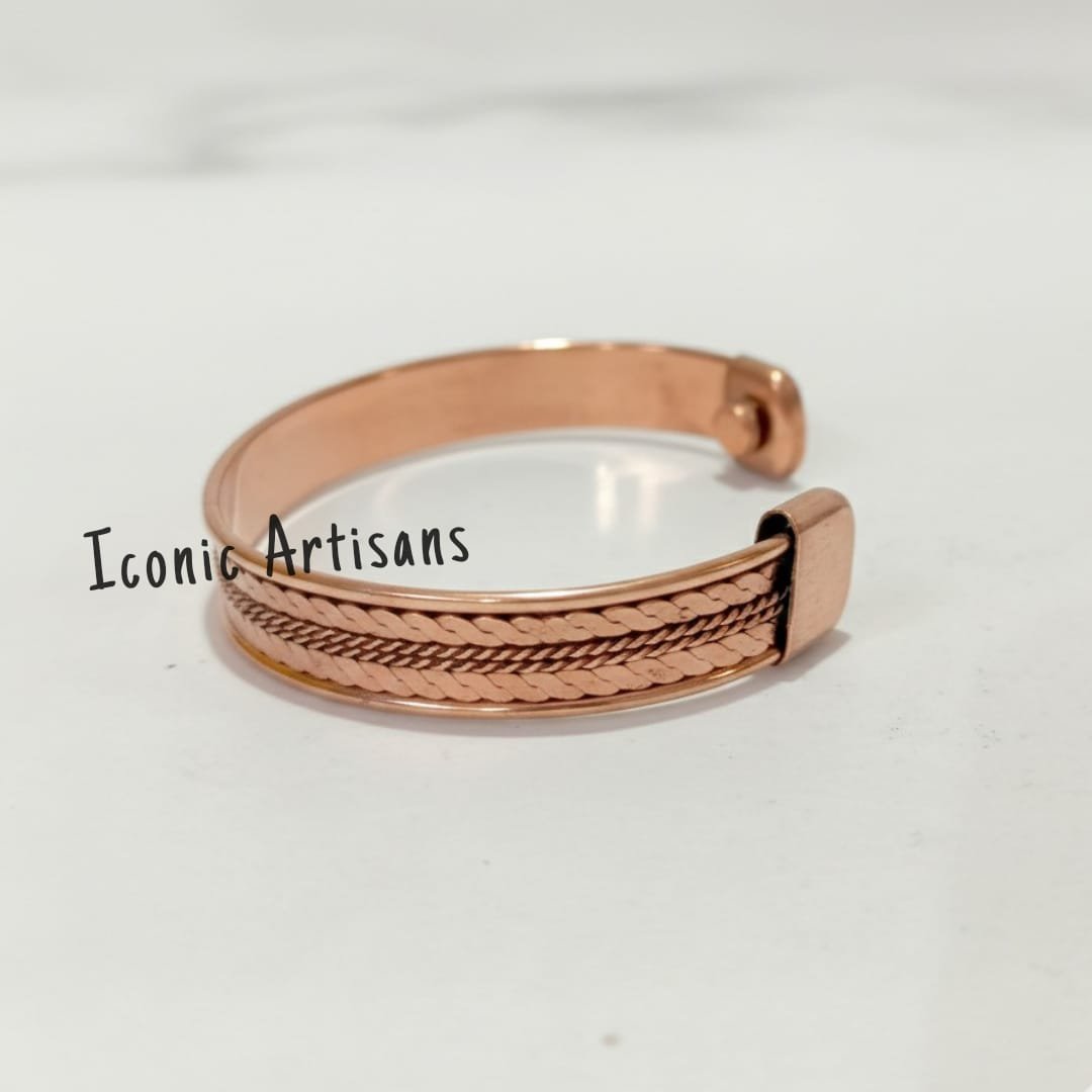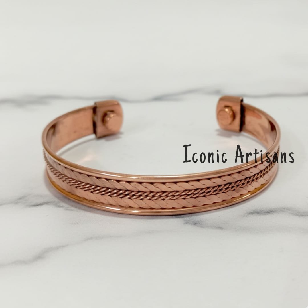 Experience the traditional allure of copper with this beautifully crafted magnetic cuff bracelet by Iconic Artisans. Made entirely from 100% pure, solid copper, this piece is distinguished by its intricate central rope-braid pattern that adds texture and classic visual appeal. The rich, warm patina of the copper will naturally evolve over time, giving your bracelet a unique, personalized character.